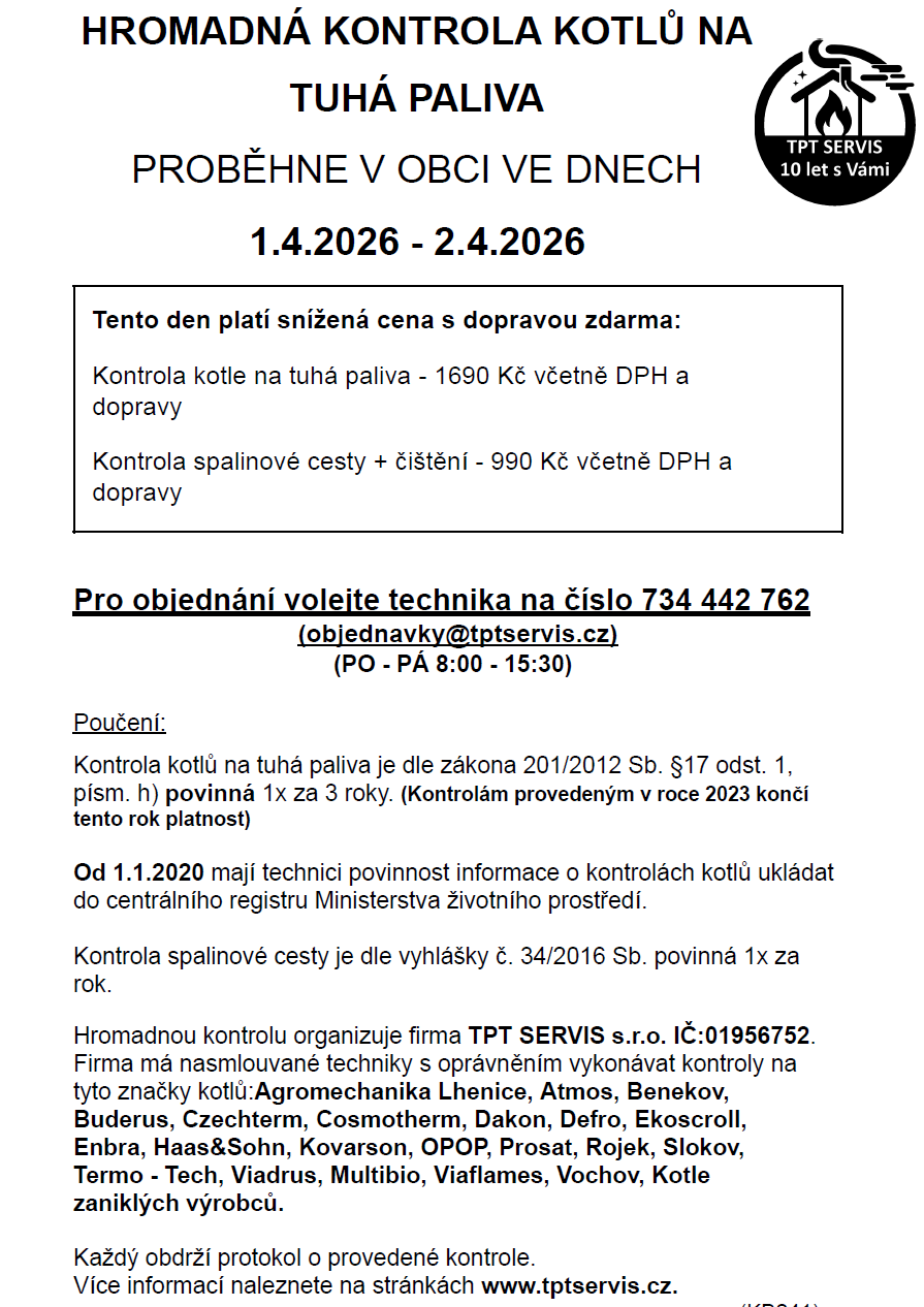 Kontroly kotlů - 1.4.2026 - 2.4.2026 15.2.2026 Vystavil: Václav Ungr Sdílet Sdílet Klikněte pro zkopírování URL Facebook Kontroly kotlů - 1.4.2026 - 2.4.2026