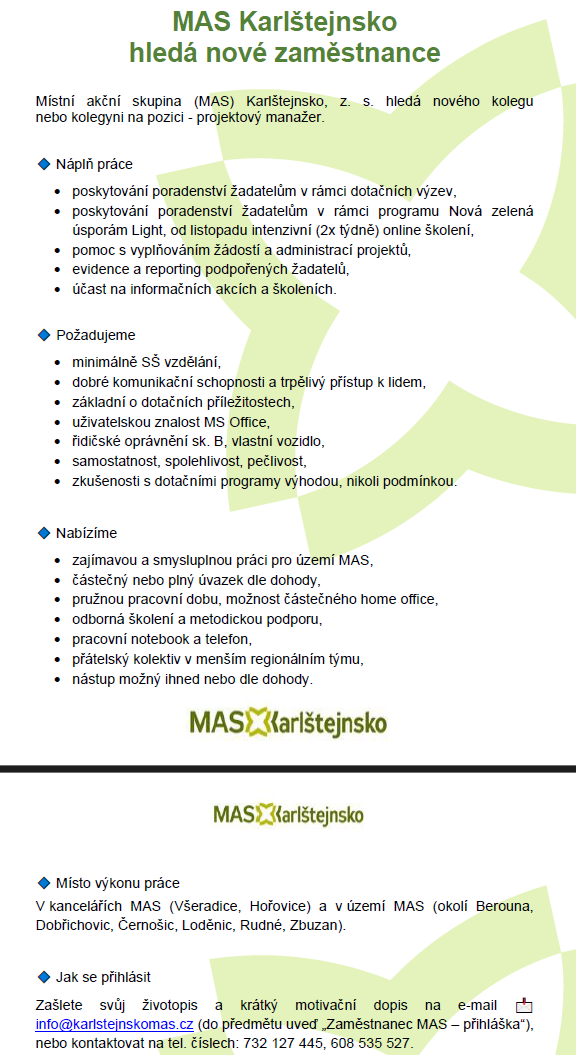 MAS Karlštejnsko 30.10.2025 Vystavil: Václav Ungr Sdílet Sdílet Klikněte pro zkopírování URL Facebook MAS Karlštejnsko hledá nové zaměstnance Přílohy MAS Karlštejnsko hledá nové zaměstnance.pdf PDF, 198.14 KB Stáhnout