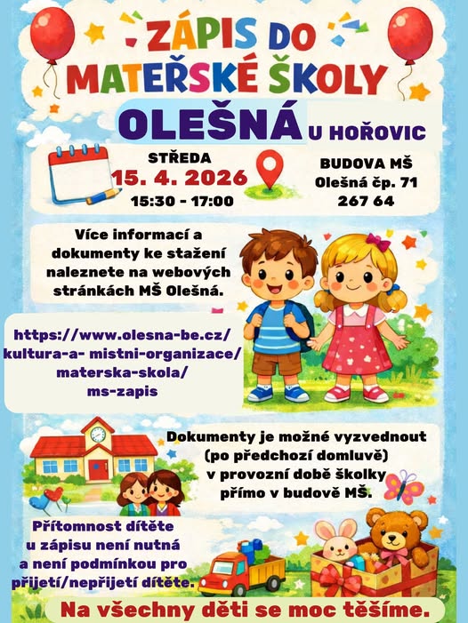 ZÁPIS MŠ OLEŠNÁ 9.4.2026 Vystavil: Václav Ungr Sdílet Sdílet Klikněte pro zkopírování URL Facebook ZÁPIS MŠ OLEŠNÁ