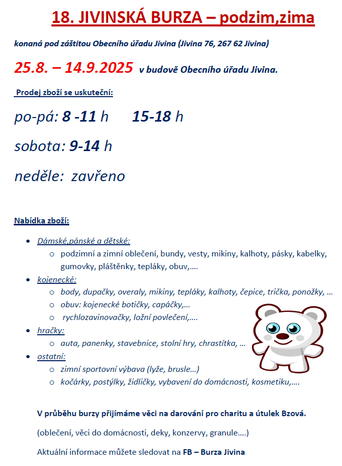 Aktuální informace můžete sledovat na FB – Burza Jivina