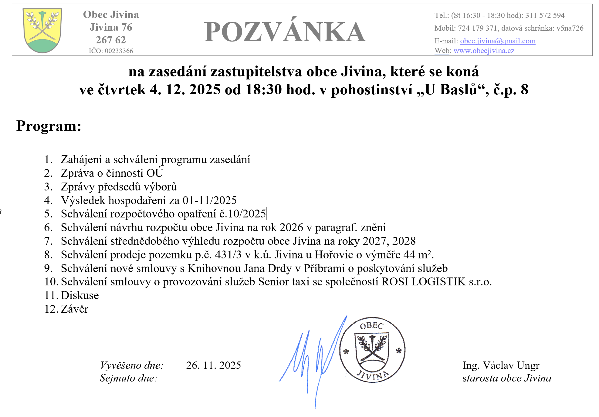 Pozvánka na zasedání zastupitelstva obce Jivina Vystaveno: 26.11.2025 Sejmutí: 4.12.2025 Vystavil: Václav Ungr Zápisy ze zasedání Přílohy Pozvánka č.4.png Obrázek, 305.76 KB Stáhnout Podrobnosti Datum vystavení: 26.11.2025Datum sejmutí: 4.12.2025